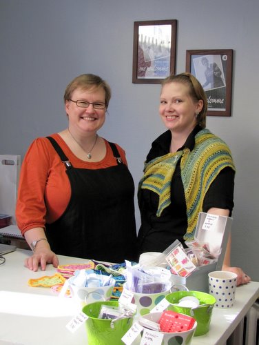 Kun ensi-ilta meni ihastellessa valikoimaa, niin toisella käyntikerrallani ehdin istahtaa ostosten teon lomassa sivuhuoneen sohvalle hetkeksi neulomaan ja hörppimään asiakkaille tarjolla olevaa teetä. Paikalle osui muutama tuttu neuloja ja saimme viettää pienen extempore-neuletapaamisen! Teen ja keksien lisäksi hyllystä löytyy vino pino neulekirjoja ja -lehtiä, joita selaamalla ideat alkavat pulputa. Kantakaupungin myymälöissä aivan liian harvinainen asiakas-wc:kin Villavyyhdissä on.