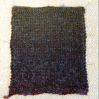 Liukuvärjätty sävy yhdistettynä erikoiseen rakenteeseen teki mallitilkun tiheyden laskemisesta erittäin haastavaa. Sukkia en tästä langasta neuloisi, huivin kyllä.