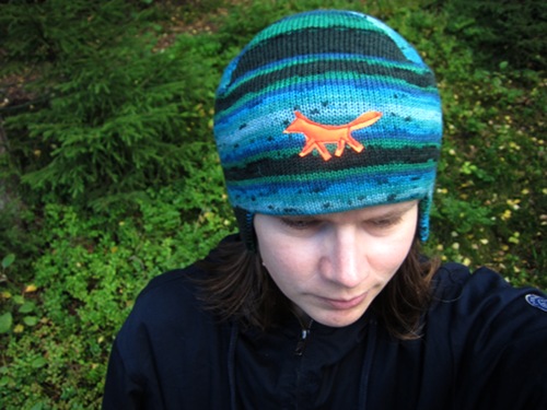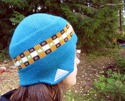Tällä pipolla haluan muistuttaa siitä, että on viisasta pitää korvat lämpiminä ja käyttää heijastinta. Tämän pipomallin kolmas viisaus on, että se mahtuu pyöräilykypäränkin alle, koska se on päänmyötäinen. Pipo on päälakiosaa lukuun ottamatta kaksinkertainen, ja siihen on ommeltu kerros fleece-kangasta kerrosten väliin korvien ja otsan kohdalle lisäsuojaksi. Neulekoneella pipoja tehtailee nopeasti vaikka koko suvulle joululahjoiksi, kullekin lahjansaajalle sopivalla heijastinkuviolla koristettuna. Piposta on ohjeessa kaksi muunnelmaa, kirjoneuleraidalla koristeltu ja yksivärinen.