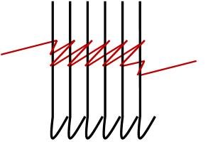 Ota työhön kerralla oikean reunan levossa olleet 15 - 16 - 16 - 17 - 18 - 18 koukkua. Neulo 1 krs. Ota vasemmalta lähin levossa oleva koukku työhön. Neulo 2 krs. Ota vasemmalta seuraava koukku työhön. Jatka kunnes levossa ovat vain työn keskimmäiset 40 - 42 - 44 - 46 - 48 - 50 koukkua sekä kaikki niistä vasemmalle olevat koukut, kelkka on oikealla ja kerroslaskurissa on lukema 82 - 84 - 84 - 86 - 88 - 90.