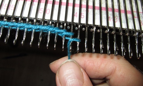 Laita kelkka neulekoneen oikeaan reunaan ja pujota lanka siihen. Luo 136 - 142 - 148 - 154 - 160 - 166 silmukkaa seuraavasti: kierrä lanka vasemmalla reunimmaisena olevan koukun ympäri. Kierrä se sitten kahden reunimmaisen koukun ympäri. Kierrä lanka toisen ja kolmannen koukun ympäri. Kierrä lanka kolmannen ja neljännen koukun ympäri. Jatka näin, kunnes jokaisen koukun ympärillä on kaksi kierrosta lankaa. Kierrä lanka niin löysästi kuin mahdollista siten että se kuitenkin pysyy koukuilla.