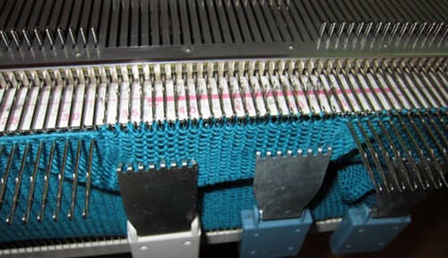 Kerroslaskurissa on lukema 82 - 84 - 84 - 86 - 88 - 90 ja kelkka on vasemmalla. Käännä kelkan vivut tavallisen neulonnan asentoon, jolloin kaikki työn koukut neuloutuvat. Neulo 42 - 44 - 44 - 46 - 48 - 50 krs. Kerroslaskurissa on lukema 124 - 128 - 128 - 132 - 136 - 140.