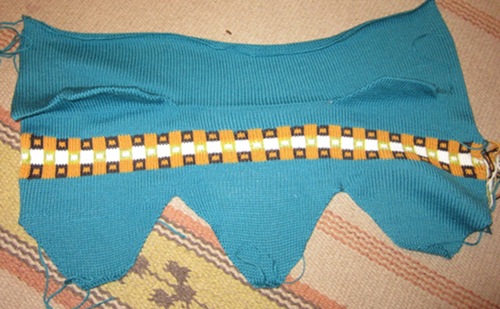 Kerroslaskurissa on lukema 111 - 113 - 113 - 115 - 117 - 119. Vaihda pääväri kelkkaan ja käännä kaikki kelkan vivut tavallisen neulonnan asentoon. Neulo 13 - 15 - 15 - 17 - 19 - 21 krs. Kerroslaskurissa on lukema 124 - 128 - 128 - 132 - 136 - 140.