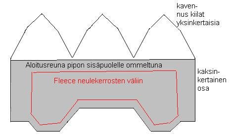 Ohutta fleeceä lisälämmikkeeksi otsan ja korvien kohdalle, noin 10 x 40 cm suikale.