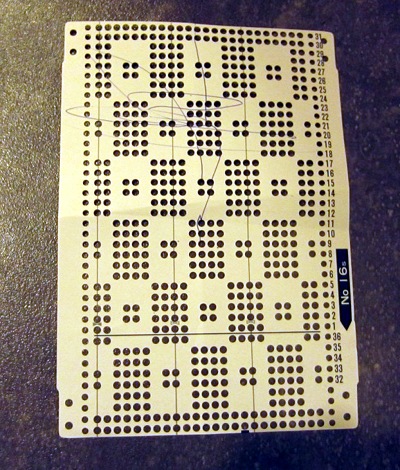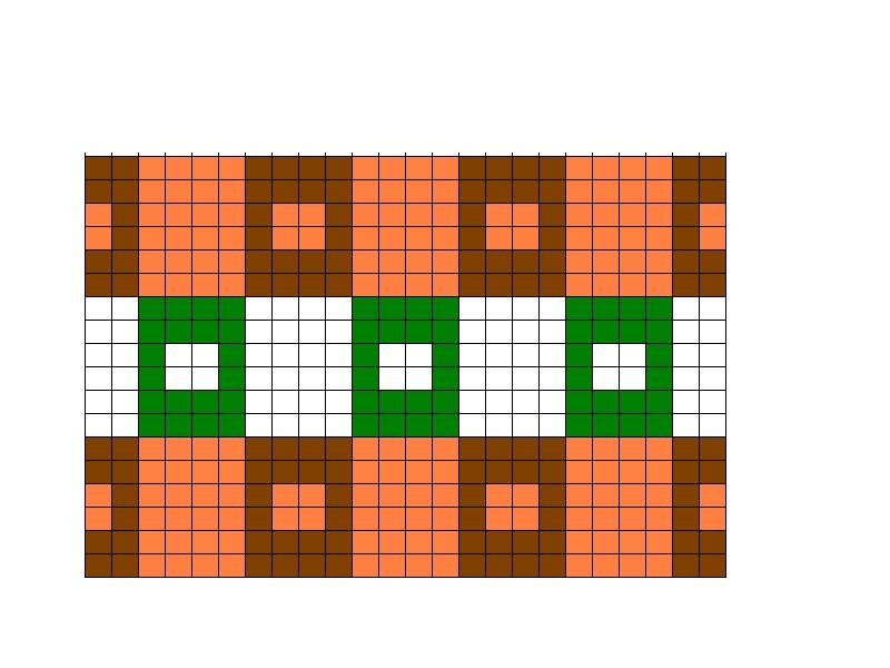 Kierrä kirjoneuleen reikäkortti neulekoneeseen kortin aloitusviivalle. Käännä reikäkortin lukitsin lukitusasentoon. Brother-neulekoneessa kierrä neulomiskelkan oikean reunan säädin KC-asentoon. Neulo 1 krs. Koukut valikoituvat kirjoneuleen ensimmäistä kerrosta varten. Käännä reikäkortin lukitsin asentoon, jossa kuvio kulkee normaalisti eteenpäin (Brother-neulekoneessa nuolikuvio). Paina kelkan kirjoneulenappi (Brother-koneessa keskimmäisenä oleva nappi, joka on merkitty kirjaimilla MC) pohjaan. Pujota kirjoneuleraidan kaksi ensimmäistä väriä kelkkaan. Neulo kirjoneuletta 6 krs. Vaihda kirjoneuleen kolmas ja neljäs väri kelkkaan. Neulo 6 krs. Vaihda kaksi ensimmäistä väriä takaisin kelkkaan. Neulo 6 krs.