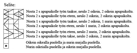 Kavennukset neulotaan 2 n yht kuvion toisen nurjan silmukan kohdalla. Toista kavennukset joka toisella kerroksella 4 kertaa ja sitten jokaisella kerroksella, kunnes jäljellä on alle 10 s.