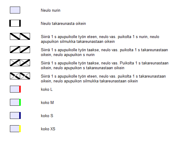 8. krs: *neulo 1 o, lisää 1 s, neulo kunnes puikolla on jäljellä 1 s, lisää 1 s, neulo 1 o*, toista *-* toisella puikolla.