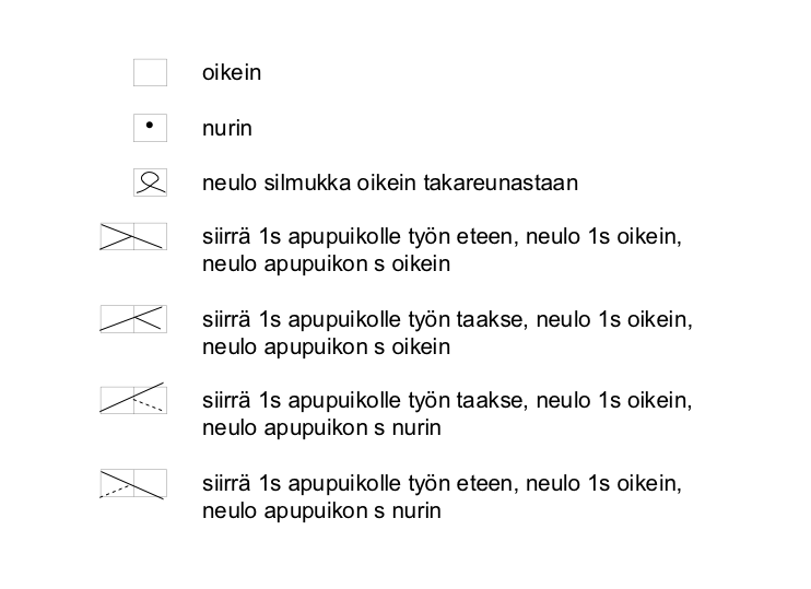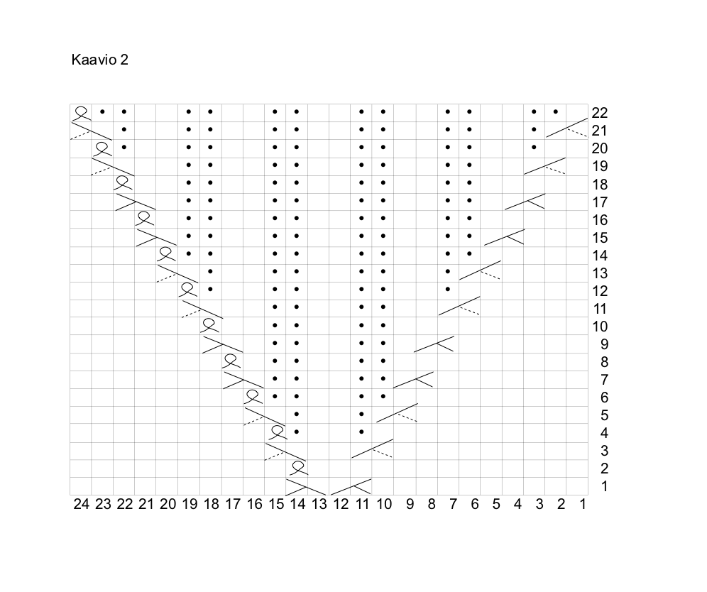 neulo 2 o yht, nosta oikean puikon 2. s juuri neulotun s yli. Jatka kaavion 1 mukaan, mutta kavenna seuravalla