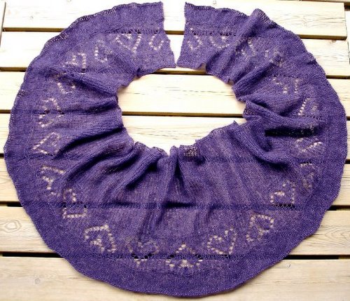 Lyhyemmän huivin voit tehdä vähentämällä silmukkamäärää 26 silmukan erissä (yksi pitsitoiston leveys). Luo esimerkiksi 267 s tai 241 s. Huomaa, että lyhennetyt kerrokset eivät mene aivan tasan viimeisellä kerroksella eri silmukkamäärällä.