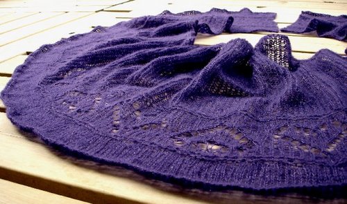 Päättele langanpäät, mutta älä katkaise niitä. Kastele ja levitä huivi kuivamaan luontireuna suorassa, asettele pitsikuvio auki ja anna röyhelön poimuttua kunnolla. Huivin kuivuttua kunnolla katkaise päätellyistä langanpäistä ylimääräiset pois.