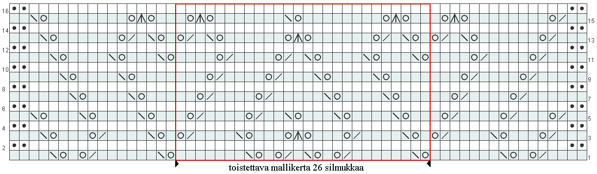 Huivi neulotaan ylhäältä alas. Ohjeen kaaviossa on merkitty sekä oikean että nurjan puolen kerrokset reunasilmukoineen. Reunasilmukat (2 s kummassakin reunassa) neulotaan aina oikein. Kaavioon on merkitty punaisilla viivoilla toistettava 26 silmukan levyinen osuus. Käytä silmukkamerkkejä merkitsemään työssä pitsikaavion toistettavia osuuksia.