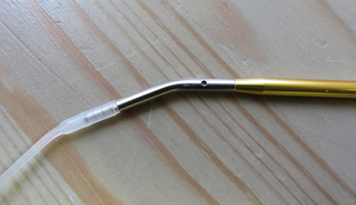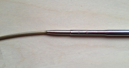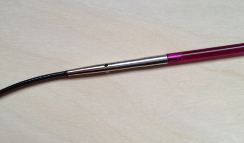 Addi ylpeilee sillä, että puikkojen kiinnityksessä ei tarvitse käyttää mitään työkaluja. Näissä puikoissa onkin selvästi muista tässä arvostelussa esitellyistä poikkeava kiinnitysmekanismi. Kaapeli työnnetään puikon sisään ja sitten sitä käännetään niin, että se lukittuu paikoilleen. Kaapelin lukittuessa puikkoon voi jotenkin kuvitella kuulevansa tai tuntevansa klik-tyylisen äännähdyksen, mistä setti on saanut nimensä. Kiinnitysmekanismi vaikuttaa kyllä kätevältä - sekä kiinnitys että avaaminen ovat helppoja eikä liitos ole kertaakaan auennut vahingossa neuloessa.
