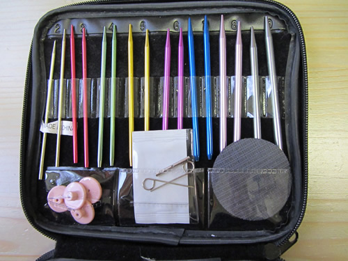 Setti on pakattu kätevän kokoiseen vetoketjulliseen koteloon. Kaikille osille löytyy paikkansa ja vaihtopäiden paikat on numeroitu. Tässäkään setissä ei kyllä ole kasvunvaraa eli, jos haluaa omistaa useammat kuin yhdet päät jotain tiettyä kokoa, ei niitä saa samaan paikkaan muiden kanssa kätevästi. Kun puikkomateriaalia on pitkään ollut vain yhtä lajia, niin sille ei ehkä ole ollut tarvettakaan. Ja kiltit neulojathan neulovat vain yhtä työtä tietyn kokoisilla puikoilla kerrallaan.