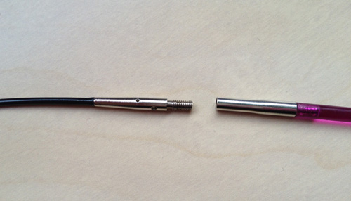 Liitäntätapa on samanlainen kuin Boyen setissä eli kaapelin päässä on kierre joka kiertyy puikon (tai puikon holkin) sisälle. Myös kiinnitysavain reikineen on samanlainen. Ja kuten Boyessa, myös näissäkin kiristäminen on tärkeä osa kiinnitystä. KnitPron valikoimaan vain ei kuulu mitään kumiläpyskää kiristämistä avustamaan. Näissä, kuten muissakin samalla kiinnityssysteemillä olevilla vaihtopääpuikoissa, pitää kiinnittää erityistä huomiota holkillisten päiden kiristämiseen - siis muiden kuin kokometallia olevien päiden. Kiristäessä kun mielellään vääntäisi vastaan koko puikon mittaisella otteella, mutta sitä ei kannata tehdä, sillä pää voi jäädä vetävän - tai tässä tapauksessa kiertävän - käteen eli puikko-osan ja holkin liimaus voi pettää.