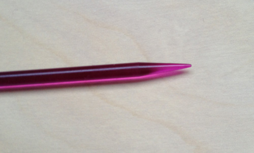 Pyöröpuikkotestissä ei ollut mukana KnitPron akryylipuikkoja, sillä jostain syystä kiinteitä pyöröjä tästä materiaalista saa vain 5 mm:stä ylöspäin. Materiaalin ominaisuuksista se ei kuitenkaan johdu, sillä irtopäissä pienin koko on 3.5 mm. Vaihtopäätestiä varten sain kokeiltavaksi 3.5 mm:n puikot. Neulontatuntuma oli suoraan sanottuna vinkeä, sillä puikot joustavat neuloessa selvästi. Tämä tuntuu alussa omituiselta, mutta loppujen lopuksi puikolla oli miellyttävä neuloa. Voisin kuvitella, että pidemmän päälle joustavat puikot olisivat hellempiä käsille, varsinkin jos oma käsiala on tiukkaa. Vinkeän mutta miellyttävän neuletuntuman vastapainona puikoissa oli todella terävä kärki, hiukan liiankin terävä ainakin minun sormenpääni mielestä.