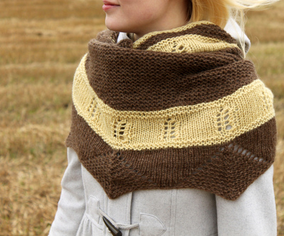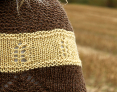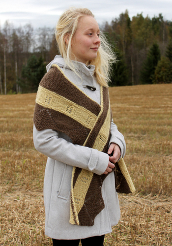 elokuisten viljapeltojen näkö ja tuntu vangittua neuleeseen. Huivi on muodoltaan pitkä ja kaareva ja suomenlampaan