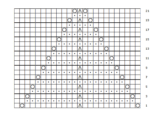 Seuraava krs (op): neulo 3 o (kaksi reunasilmukkaa + 1 o) ja aloita sitten kaavion neulominen 1. kerrokselta. Toista kaavio 10 kertaa, 2 o.