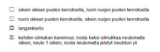 Kaavioon on merkitty sekä oikean että nurjan puolen kerrokset. Silmukkamäärä pysyy aina samana. Molemmissa päissä neulotaan joka kerroksella kaksi reunimmaista silmukkaa aina oikein, ja jokaisen oikean puolen kerroksen alussa yksi silmukka sileää ennen kaavion aloitusta.