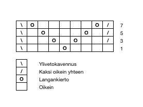 Neulo kavennukset nauhakavennuksena: neulo 1. puikon lopussa 2 s oikein yhteen, 2. puikon alussa ylivetokavennus, 3. puikon lopussa 2 oikein yhteen ja 4. puikon alussa ylivetokavennus. Neulo ensimmäisten kolmen kavennuskerroksen väleihin yhdet sileät kerrokset. Jatka sen jälkeen kavennuksia jokaisella kerroksella, kunnes silmukoita on jäljellä 8. Katkaise lanka, vedä se silmukoiden läpi ja päättele langanpäät.