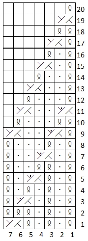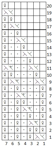 7. krs: Nosta 1. s oikein neulomatta, *nosta 1 s oikein neulomatta, 1 o*, toista *-* yhteensä 4 kertaa, noista 1 s oikein neulomatta, ylivetokavennus, 1 o, käännä