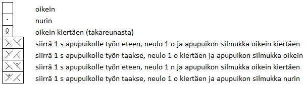 1. krs: nosta 1. s oikein neulomatta, *nosta 1 s oikein neulomatta, 1 o*, toista *-* yhteensä 7 kertaa, ylivetokavennus, 1 o, käännä
