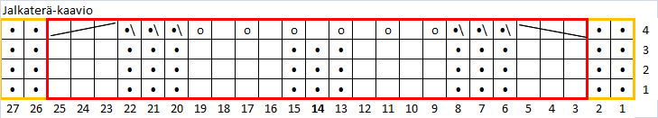 Nosta 1 s neulomatta, 2 o yht, siirrä neulomatta nostettu silmukka yhteen neulottujen silmukoiden yli, *[1 n, 1 o] 8 krt, 1 n, 3 o yht*, toista *-*, *1 n, 1 o*, toista *-* 2 krt, 1 n, nosta 1 s neulomatta, 2 o yht, siirrä neulomatta nostettu silmukka yhteen neulottujen silmukoiden yli, *1 n, 1 o*, toista *-* 7 krt, 1 n.