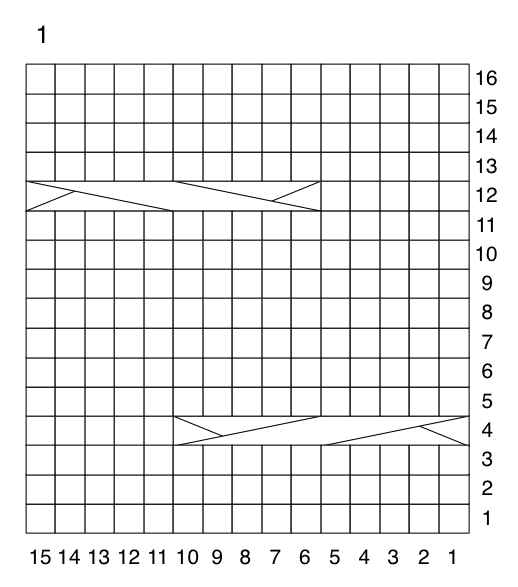 Jatka näin, kunnes olet neulonut kaavion 1 kerrokset 1-16 yhteensä 3 krt ja kaavio 2 on toistettu yhteensä 12 krt.