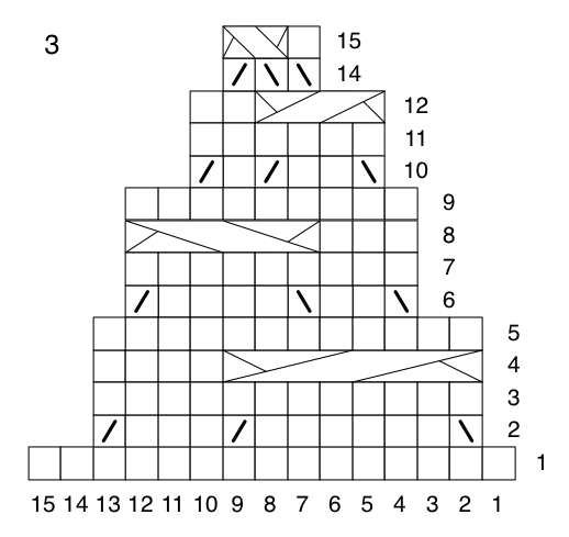 13. krs: Kaavio 3, *1 n, 1 o*, toista *-* kerroksen loppuun asti.
