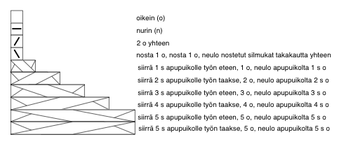 7. krs: Kaavio 3, *1 n, 1 o*, toista *-*, kunnes jäljellä on 1 s, 1 n.