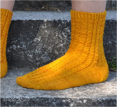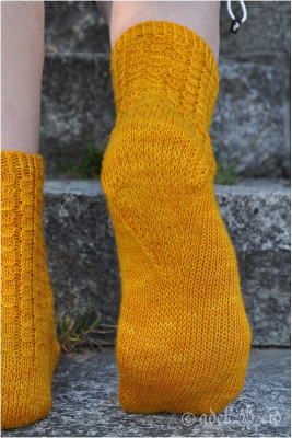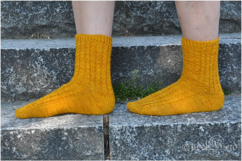 Päättele langanpäät. Kostuta, pingota sukkablokille ja anna kuivua tai vaihtoehtoisesti höyrytä sukat kevyesti kostean liinan läpi ja anna kuivua.