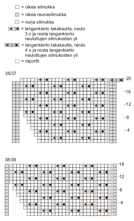 Neulo 13 - 14 - 15 - 16 - 17 - 18 o, nosta 1 s, oikealle kallistuva lisäys, 1 o, nosta 1 s, 1 o, vasemmalle kallistuva lisäys, nosta 1 s, 13 - 14 - 15 - 16 - 17 - 18 o. Seuraavalla krs:lla kaikki o.