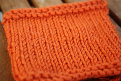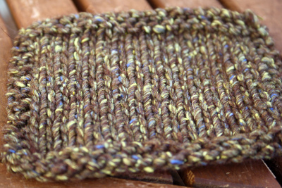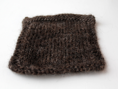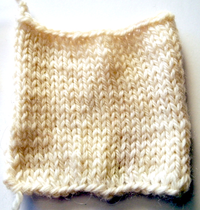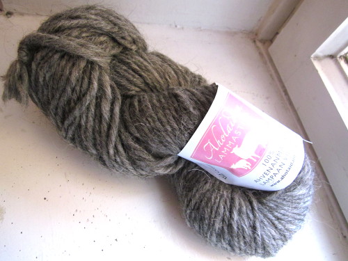 Puikkosuositusta lankaan ei siis ollut, mutta näppituntumalla valitsin 7 millin puikot ja ne osoittautuivatkin hyviksi. Lankaa keriessä se tuntui kovalta ja kankealta ja lisäksi sillä oli pieni taipumus kiertyä itsensä ympärille saparoille, mutta neulotusta pinnasta tuli varsin sileää, taipuisaa ja joustavaa noin paksuksi langaksi. Langan huomaa helposti olevan 100-prosenttista villaa, sillä siitä sojottaa paljon paksuja ja teräviä karvoja, joita myöskin neuloessa tippui joka paikkaan. Irtokarvat aiheuttivat myös aivastelua neuloessa. Varsinkin tälle paksulle langalle minun on hankala keksiä käyttökohdetta, sillä se kutittaa niin paljon sekä paljasta ihoa että vielä paidan läpikin. Huovutettuna tämä voisi toimia.