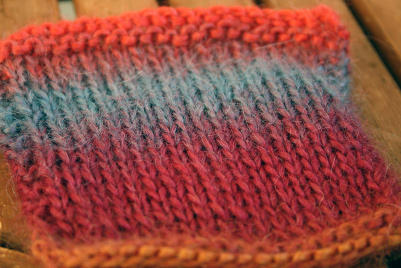 Austermannin uutuuslanka on varsinaista väri-iloittelua. Alpakan ja villan sekoitus tuo langalle hieman pörheän olemuksen, mikä näkyi neuloessa siten, että langasta ja tilkusta lähti jonkin verran irtokarvaa. Tätä lankaa en suosittelisi neulojalle, joka on kovin herkkä irtokarvalle, sillä sitä irtosi tosiaan jo mallitilkkua neuloessa kohtalaisesti.