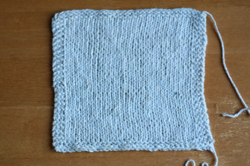 Sain 4,5 millin puikoilla tiheydeksi 16 silmukkaa ja 28 kerrosta kymmenellä sentillä. Se onkin sopiva tiheys esimerkiksi huiviin. Vaatteeseen kannattaa valita pienemmät puikot ja suurempi tiheys. Mallitilkku venähti leveyssuunnassa kasteltaessa. Tiheys ennen kastelua oli 20 s / 10 cm. Kerrosluku pysyi samana. Kannattaa siis neuloa mallitilkku ja kastella se, jotta tietää, miten lanka käyttäytyy omalla neuletiheydellä.