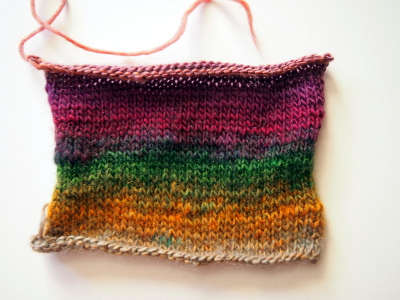 Pesussa testitilkku rentoutui jonkin verran, kuten alpakalla on tapana. Siksi suosittelen ehdottomasti tekemään mallitilkun, jos teet Caleidosta jotain isompaa. Rasitustestissä tilkkuun tuli hieman nyppyjä, mutta ei häiritsevää määrää. Kun ottaa huomioon, että lanka on yksisäikeinen, kesti se hyvin rasitusta. Neuletuntuma langassa on erittäin mukava ja voisin hyvinkin itse neuloa tästä iloisen raitakaulurin talveksi kaulaan kieputettavaksi.