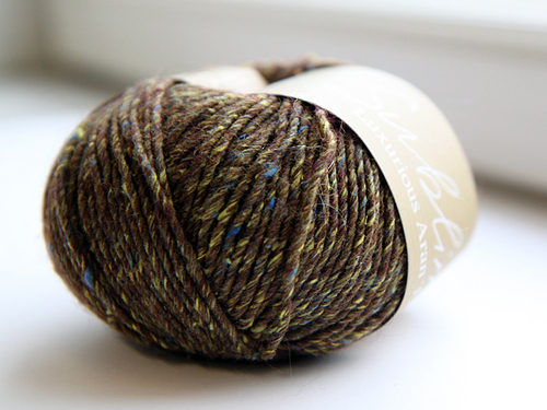 Luxurious Aran Tweedistä neulot ihanat palmikkoneuleet koko perheelle. Se sopii niin asusteisiin kuin isompiinkin neuleisiin. Tweed-langoille tyypillisesti siinä on langan perusväristä huomattavasti eroavaa väriä tuomassa tweed-efektiä. Testikerän sininen tweed tuo mukavaa eloa vihreään ja ruskeaan.