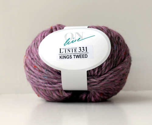 Sympaattinen. Se on ensimmäinen adjektiivi, joka edessäni nököttävästä Kings Tweed -kerästä tulee mieleen. 50 gramman kerä on kooltaan iso ja tuntuu pehmeältä ja pöyheältä. Väritykseltään lanka on mielenkiintoinen. Yksikierteinen lanka on pohjimmiltaan jotakin vaaleanpunaisen ja violetin väliltä, mutta pohjavärin lisäksi langassa on tummempia ja kirjavia kuituja. Yleisilmeeltään väritys tuo mieleen syksyisen marjapuuron. Värikarttaan kuuluu testattavan sävyn lisäksi viisi muuta maanläheistä värivaihtoehtoa.
