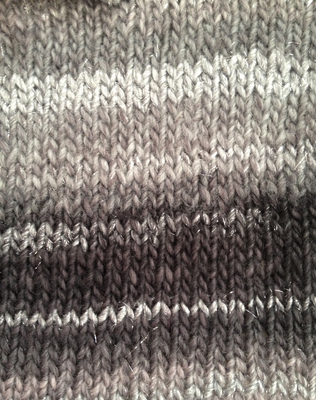 Lanka on löyhäkierteistä, hieman pörheää ja neulepinnasta tulee pehmeän näköistä. Lanka tuottaa raidallista pintaa, jossa vaihtelee harmaan ja mustan sävyjä ja hopeanväristä kiiltoa. Kiilto on erotettu omiksi raidoikseen, joissa hopeasäikeitä on runsaasti. Osiot eivät kuitenkaan ole saman levyisiä saati ihan tarkkarajaisia, joten neulepinnasta tulee elävä ja vaihteleva. Väriosiot ovat kohtalaisen kokoisia, mutta eivät kovin suuria, joten langan voi olettaa olevan parhaimmillaan asusteissa. Suuremmissa pinnoissa raidat voivat levitä hieman liian suuriksi ja vaikutelma voi jossain kohdissa olla jopa pätkävärjätyn oloinen. Kokeilin mallitilkkuja parilla eri silmukkamäärällä ja sain mielestäni kivan näköistä pintaa aikaiseksi noin 40 silmukalla, missä siinäkin lyhyimmät bling-raitaosiot olivat lähes yhden kerroksen mittaisia. Lankaa oli miellyttävä neuloa, vaikka siitä irtosi neuloessa hieman blingiä. Valmis neulepinta ei kuitenkaan varise.