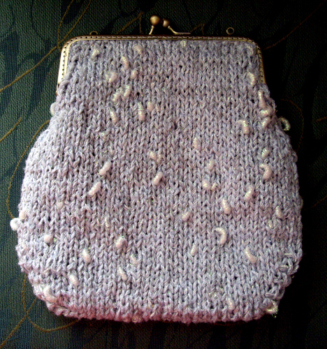 Piirrä neulotun laukun ja kukkaronkehyksen avulla kaava, jolla leikkaat vuorikankaan. On tärkeää, että kukkaronkehyksen reuna ja vuori ovat yhteensopivat. Joustavaa neuletta voi hiukan venyttää tai syöttää tarvittaessa. Ompele vuori koneella muotoonsa ja kiinnitä se käsin neulelaukun yläreunaan. Kiinnitä lukko käsin ompelemalla.