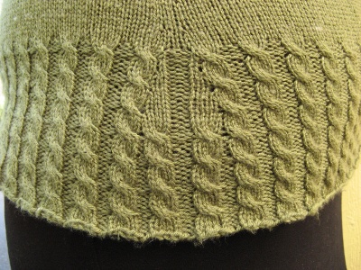 Toista lisäyksiä, kunnes työssä on 312 s. Jatka sitten palmikkoneuletta ruutupiirroksen mukaan, kunnes palmikkoneuleen korkeus on noin 12 cm. Päätä s:t hyvin löysästi neuloen oikeat s:t o ja nurjat n.