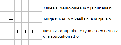 K & k = kiedo ja käännä. Nosta seuraava s neulomatta, vie työn lanka nostetun silmukan ja vasemman puikon välistä työn toiselle puolelle, palauta nostettu silmukka vasemmalle puikolle, käännä työ.Ohje