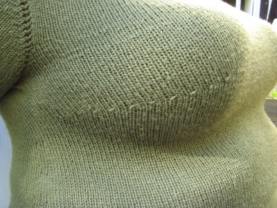 Jatka vartaloa rintamuotoilujen jälkeen sileänä suljettuna neuleena vielä 10 cm. Aloita sitten lisäykset sivusaumoissa.