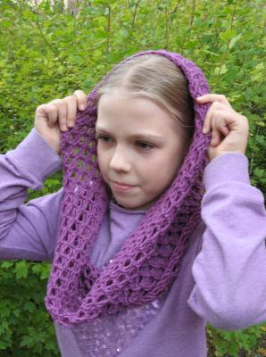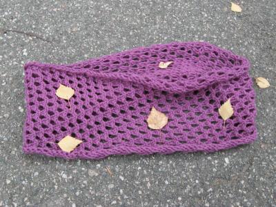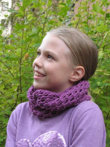 Syksyn kylmien aamujen koittaessa huomasin, kuinka viluinen lapsi kietoi kaulaansa vanhaa ohutta kaulahuivia. Muista projekteista oli jäänyt pari kerää paksua luumunpunaista merinovillalankaa. Halusin paksun langan vastapainoksi keveän neulepinnan. Yksinkertainen isoreikäinen pitsineule syntyy kaksinkertaisilla langankierroilla.