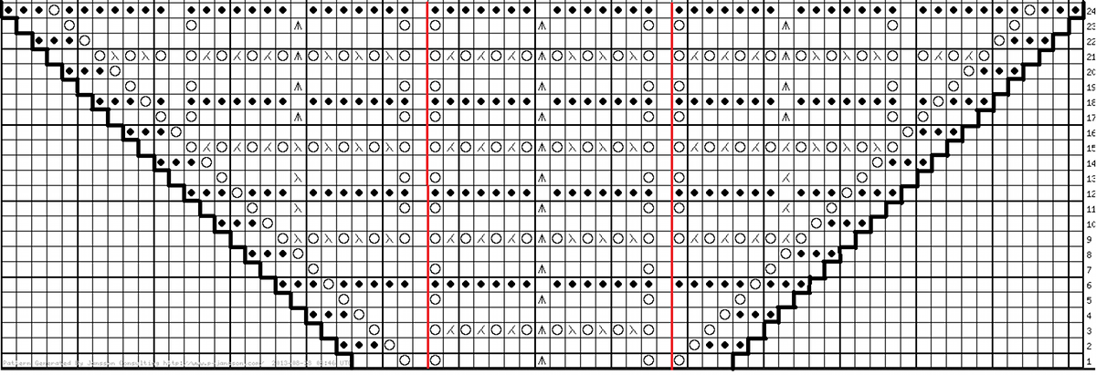 Neulo nyt pitsireunus kaavion mukaan. Kaaviossa näkyvät sekä oikean että nurjan puolen kerrokset. Myös reunasilmukat on merkitty. Neulo kaavion kerrokset 1-24 kerran. Punaisella rajattu alue toistuu kerroksella 14 kertaa.