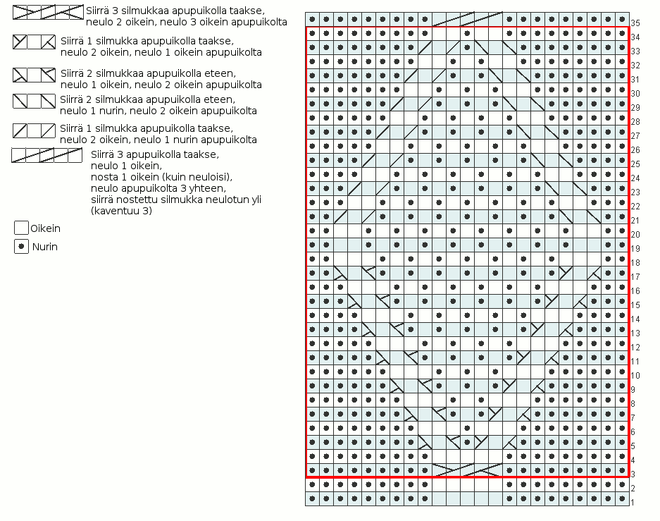 Neulo, kunnes kaavio 1 on neulottu 1,5 kertaa. Kaaviossa toistetaan kerroksia 3-34. Toistettava alue on merkitty punaisella. Kerrokset 1 ja 2 neulotaan vain alussa ja krs 35 vain lopussa. Kun kaavio on toisessa toistossa kerroksella 19, neulo kantapää kerroksien 19 ja 20 välissä. Neulo kantapää haluamallasi tavalla. Mallisukassa on neulottu tiimalasikantapää Ullan ohjeiden mukaan.