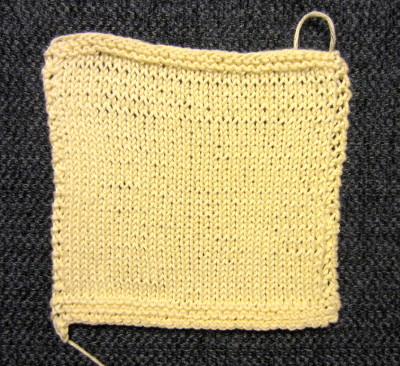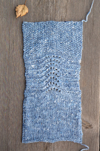 Sekä sileästä neuleesta että pitsistä tuli kaunista. Helmineulepinta tuotti pettymyksen: pinnasta tuli sekavan ja sotkuisen oloinen. Langan sattumat olivat helmineuleelle sittenkin liian suuria. Koko mallitilkku on neulottu samoilla puikoilla. Varsinkin pitsipinnassa puikkokokoa kannattaisi suurentaa.