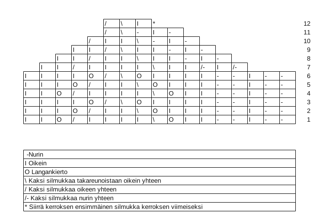 1. krs: * Neulo 2 n, 1 o, 2 n, 12 o*, toista *-* kerros loppuun eli yhteensä kuusi kertaa.