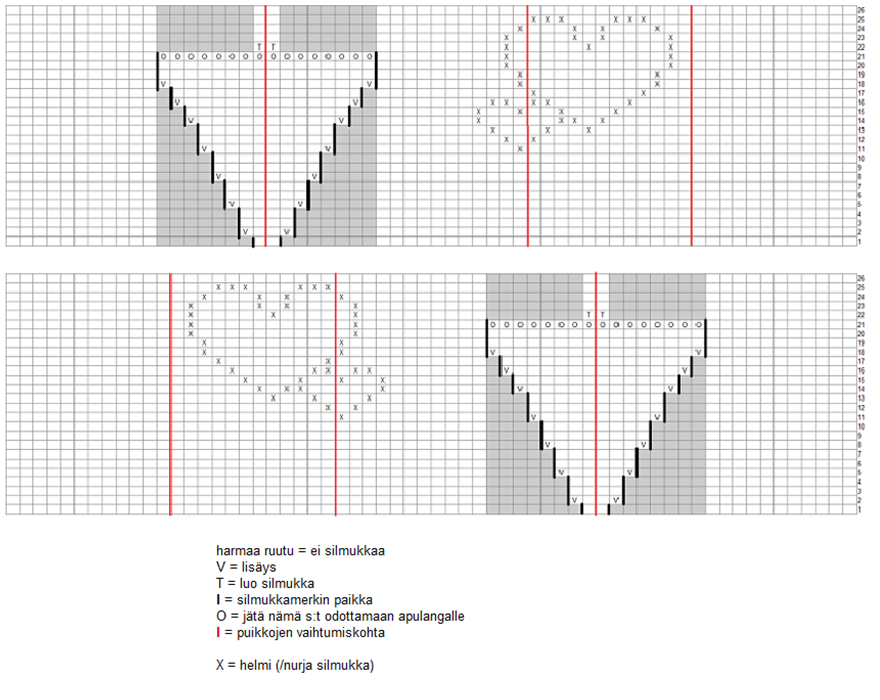 Kaaviot ovat toistensa peilikuvat. Valitse kaavio sen mukaan, oletko oikea- vai vasenkätinen ja mihin suuntaan haluat lukea kaavioita. Muista aloittaa helmien pujottaminen neljännellä lisäyskerroksella! Kun peukalokiila on valmis ja olet nostanut 16 s odottamaan, luo niiden tilalle 2 s. Kaikilla puikoilla pitäisi olla nyt 12 s. Poista silmukkamerkit ja jatka sileää oikeaa sekä helmien pujottamista. Kun kuvio on valmis, neulo 2 cm sileää oikeaa ja aloita sitten yläreuna.