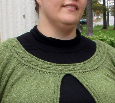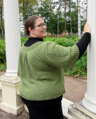 Neulo sitten kaarrokkeen kolmas lisäyskerros seuraavasti: neulo etureunan 9 s kuten edellä, neulo 3 o, *lisää 1 s haluamallasi tavalla, 8 — 4 — 8 o*. Toista *—* kunnes kerroksella on jäljellä 14 — 9 — 14 s. Lisää 1 s, neulo 5 — 1 — 5 o, neulo etureunan 9 s kuten edellä. Työssä on 360 — 394 — 450 s.