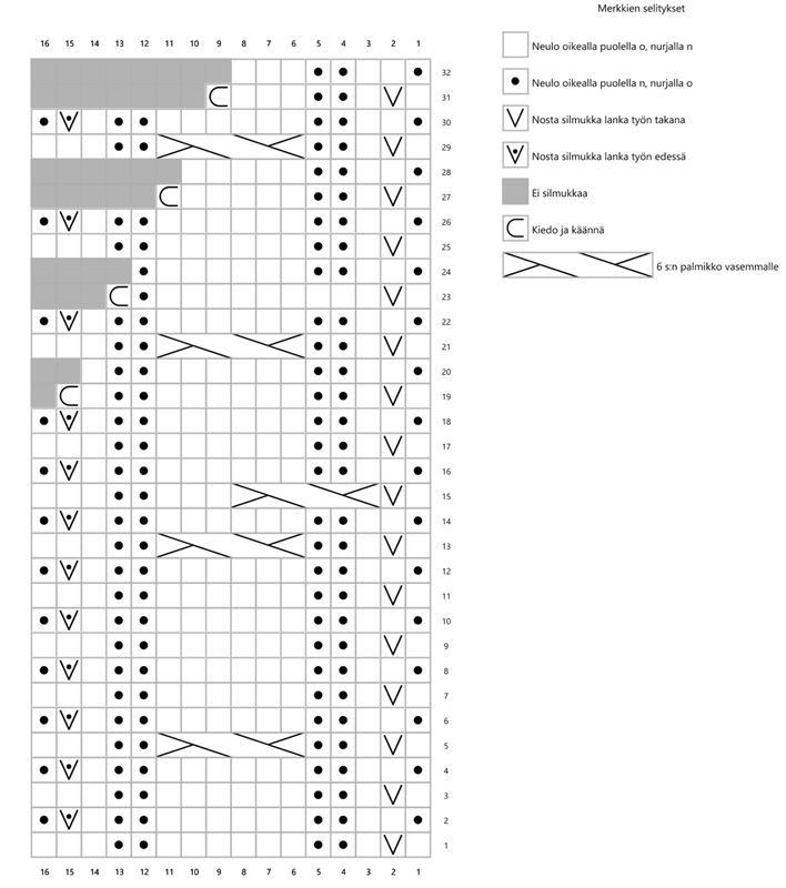 Luo 16 s ja neulo pohjustuskerrokseksi 1 o, 2 n, 2 o, 6 n, 2 o, 2 n, 1 o. Aloita seuraavalla kerroksella kauluskaitaleen pintaneule ruutupiirroksen mukaan. Toista kerrokset 1-32 ensin 7 — 7 — 8 kertaa, sitten kerrokset 1-16 kerran. Päätä silmukat. Ompele kauluksen päät yhteen siten, että kaitale muodostaa renkaan. Kauluksen sauma jää valmiissa työssä niskaan.